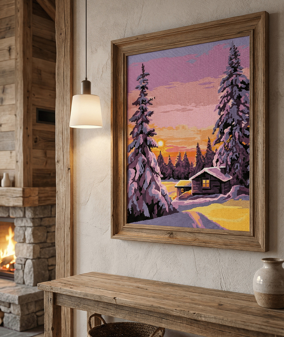 La richesse des dégradés de violets et les textures de la pierre offrent un ouvrage particulièrement plaisant à broder pour une décoration chaleureuse.