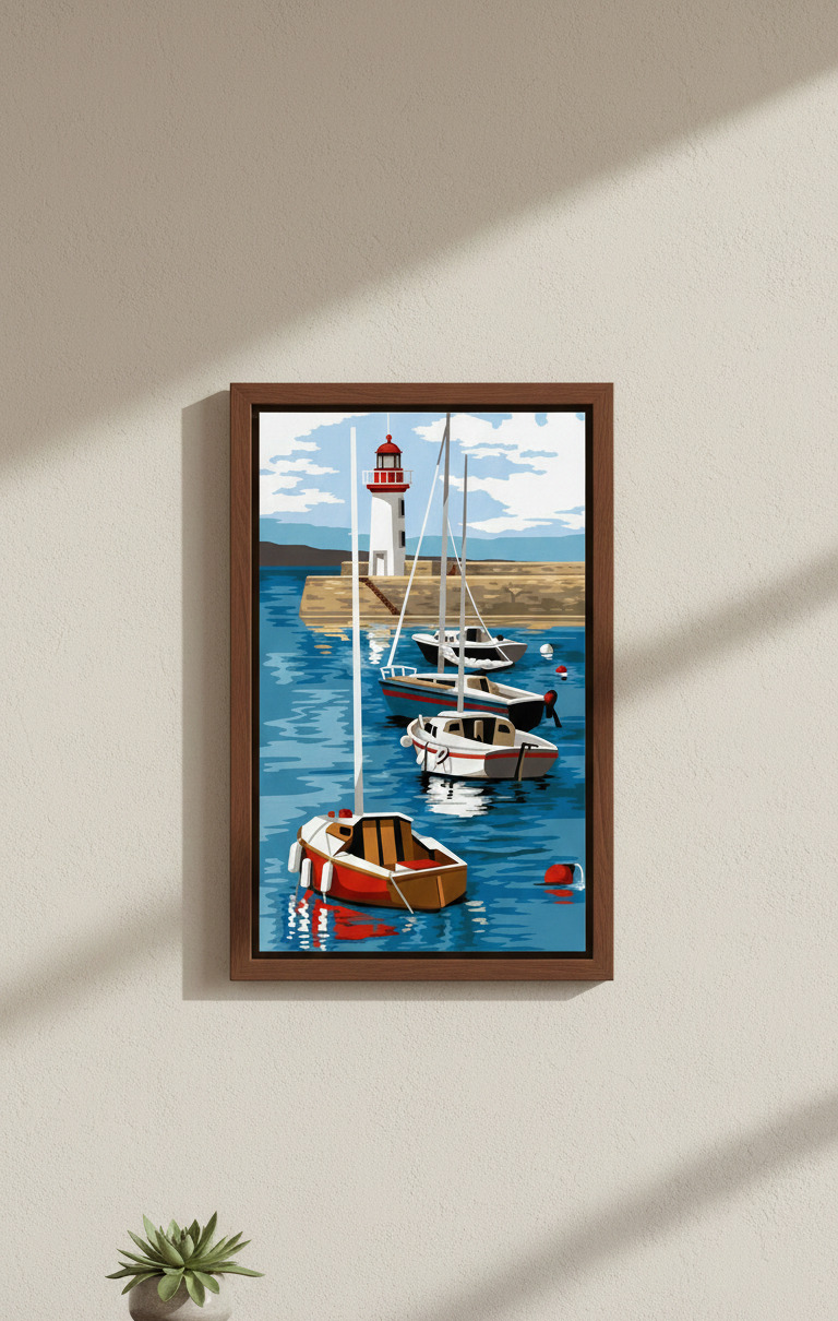 Le dessin met en lumière un phare blanc et rouge surplombant une jetée, tandis que plusieurs bateaux de pêche et voiliers reposent tranquillement sur une eau aux reflets bleus profonds.