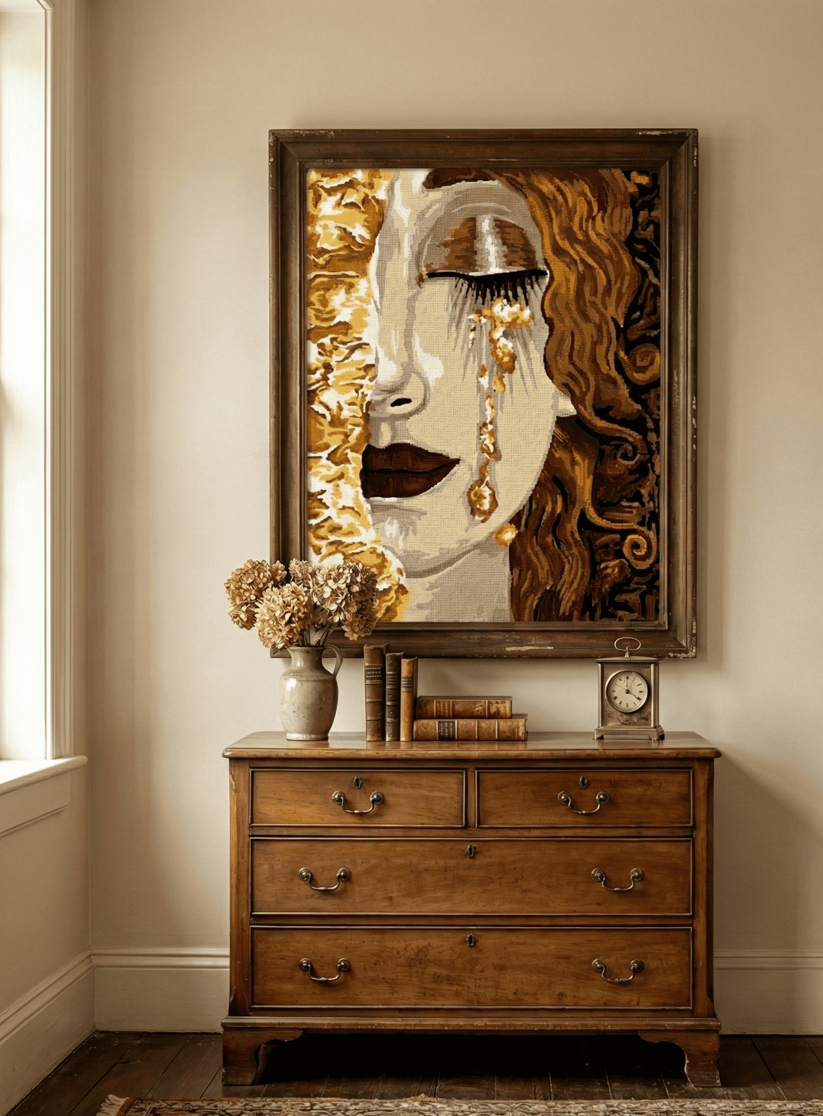 Ce modèle rend hommage au style de Gustav Klimt « Les Larmes d’or » à travers un portrait féminin empreint de mélancolie et de préciosité. Le visage aux yeux clos et aux lèvres sombres est sublimé par des coulées d’or et des motifs ornementaux tourbillonnants, offrant un visuel d’une grande richesse artistique.