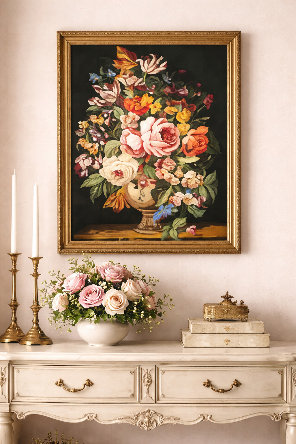 Ce canevas SEG de Paris, met en valeur une somptueuse composition florale aux couleurs riches et harmonieuses, disposée dans un élégant vase, sur fond sombre, rappelant les natures mortes classiques de la peinture européenne.