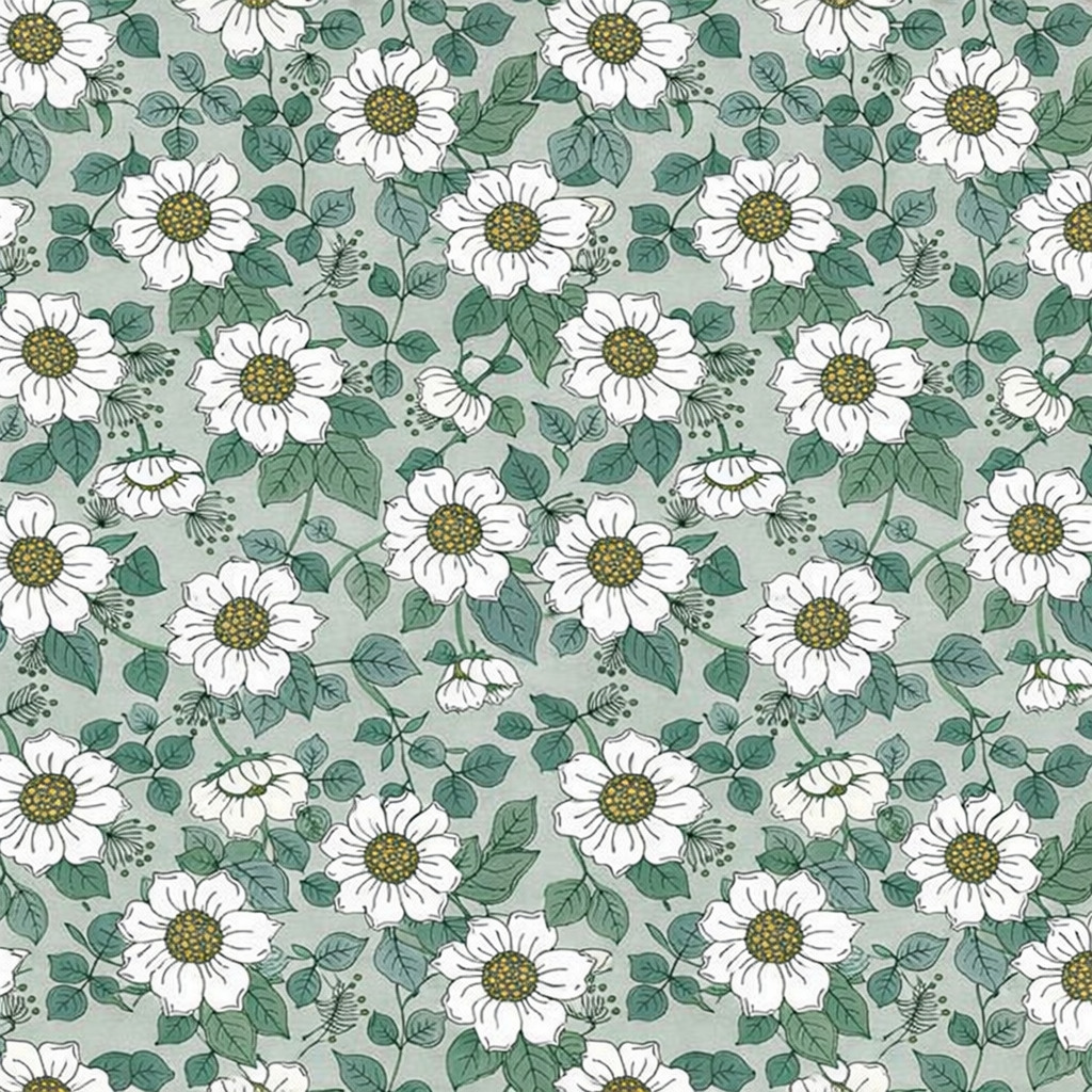 Sur un fond vert sauge doux et poudré, une pluie de fleurs blanches aux cœurs dorés se déploie dans un style illustration botanique vintage.