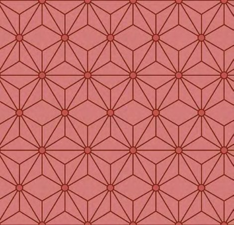 Sur un fond vieux rose poudré, un réseau de lignes graphiques s’entrelace pour former des étoiles géométriques.