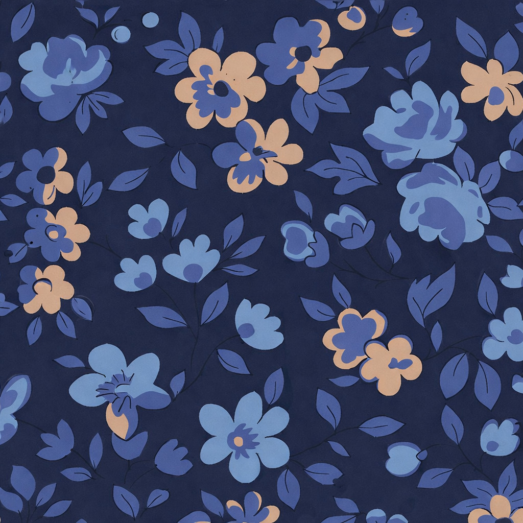 Sur un fond bleu nuit profond, une danse de fleurs stylisées se déploie dans une harmonie de bleu azur et de beige sable.