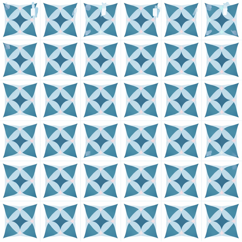 Sur un fond blanc pur et lumineux, un jeu de corolles stylisées se déploie dans une harmonie de bleus doux et profonds.
