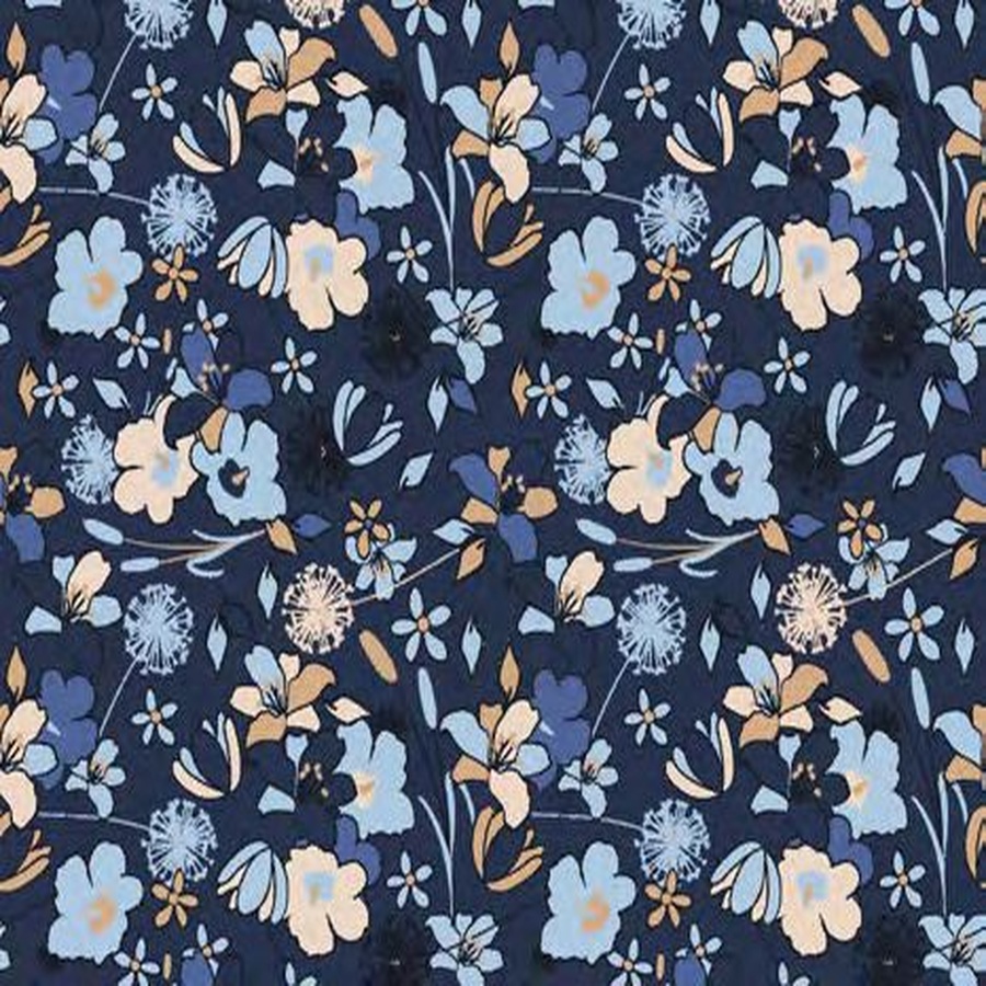 Sur un fond bleu nuit profond, une danse de fleurs sauvages et de pissenlits stylisés se déploie dans une palette harmonieuse de bleu ciel, crème et ocre doré.