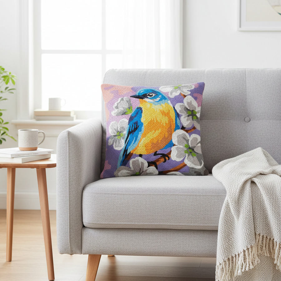 Ce modèle élégant représente un petit oiseau chanteur au plumage bleu azur et jaune vif, niché au milieu de fleurs blanches printanières.