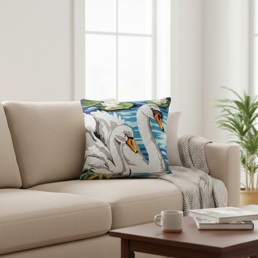 Apportez une atmosphère de calme et de raffinement à votre intérieur avec ce kit de canevas pour coussin représentant un couple de cygnes sur l’eau.