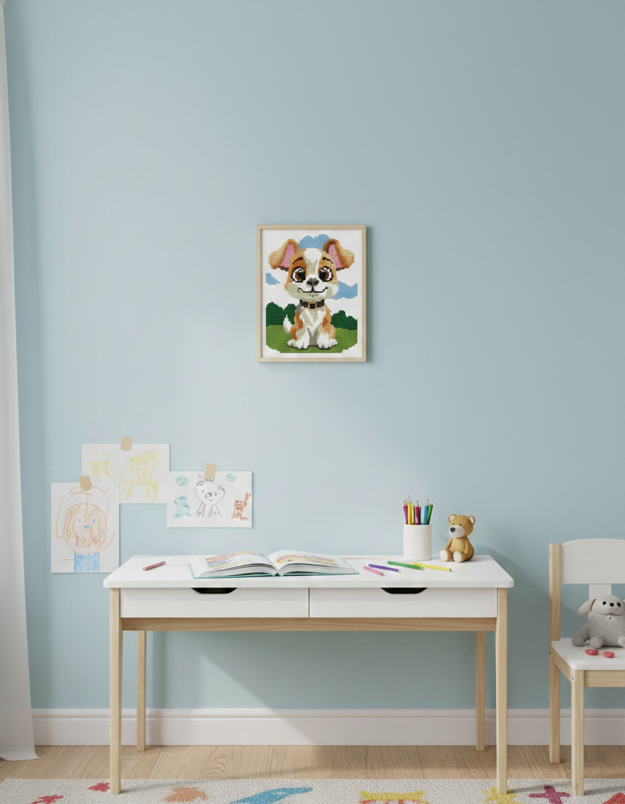 Kit de point de croix Marie-Cœur représentant un adorable chien mignon pour la décoration de chambre enfant, comprenant une toile coton blanche imprimée Aïda 7 (18 count), 12 couleurs de fils à broder DMC, 1 aiguille et un diagramme en couleurs avec explications détaillées, idéal pour débutants et loisirs créatifs, parfait pour créer un tableau décoratif tendre et moderne, cadeau créatif pour bébé ou enfant, facile à encadrer et à personnaliser, rendu chaleureux et amusant pour embellir la chambre de votre enfant.