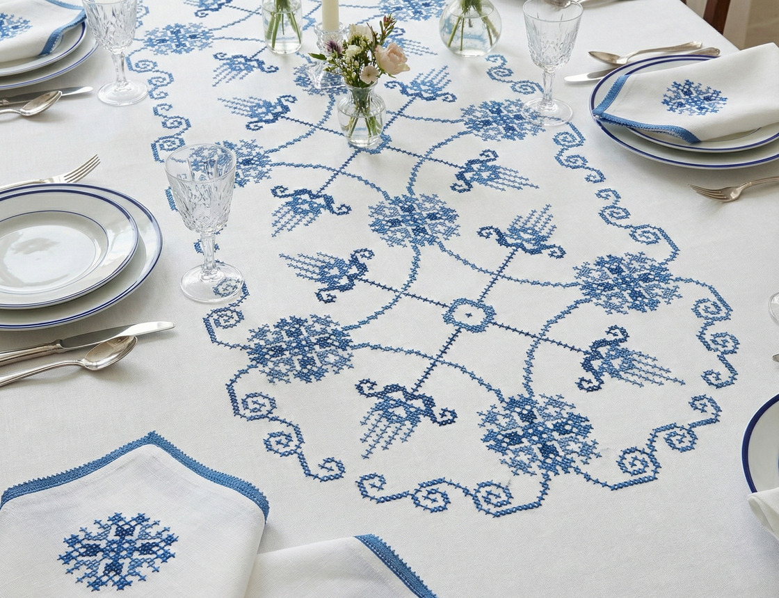 Apportez une élégance nordique à votre table avec ces motifs géométriques bleus, prêts à être réalisés au point de croix.