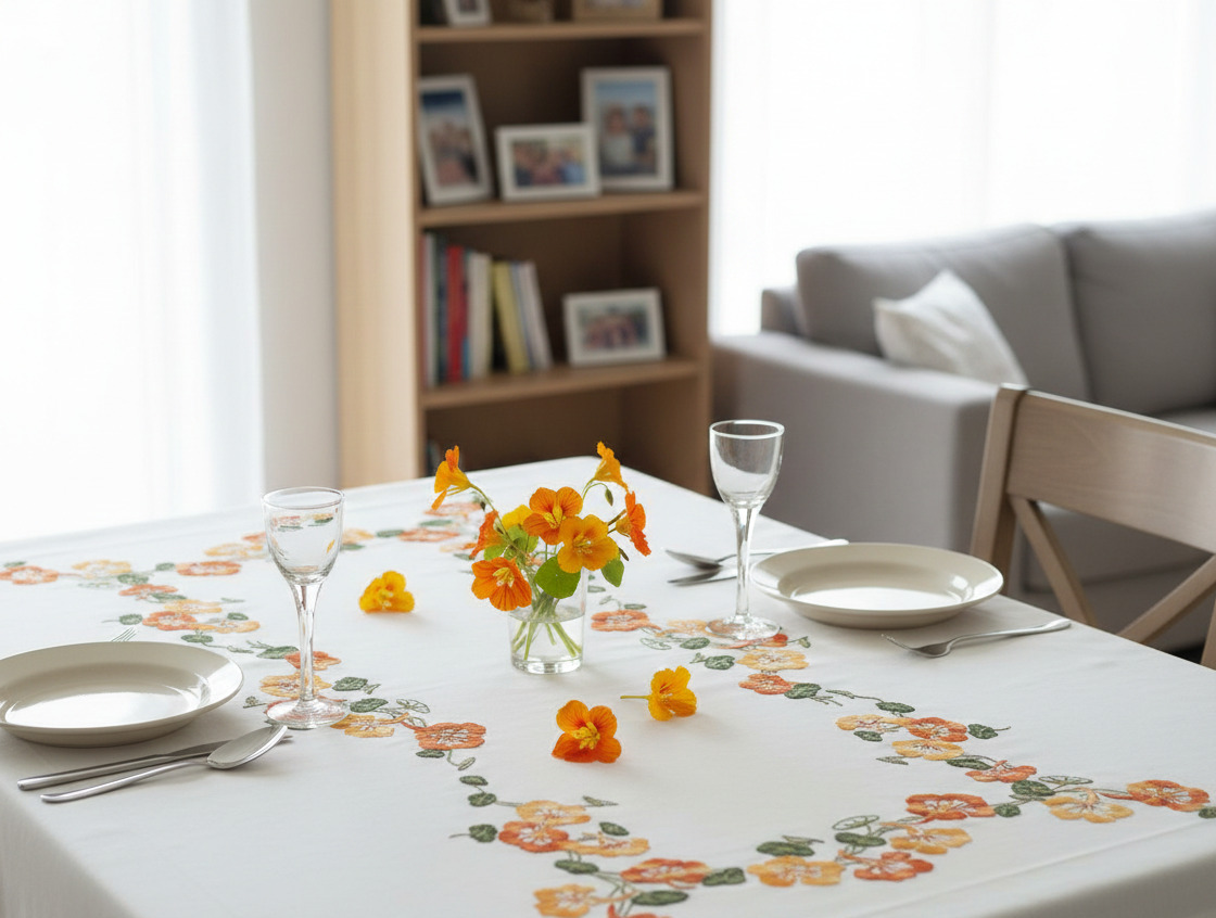 La toile imprimée présente une généreuse guirlande de capucines courant le long de la table, accompagnée de leur feuillage arrondi caractéristique.